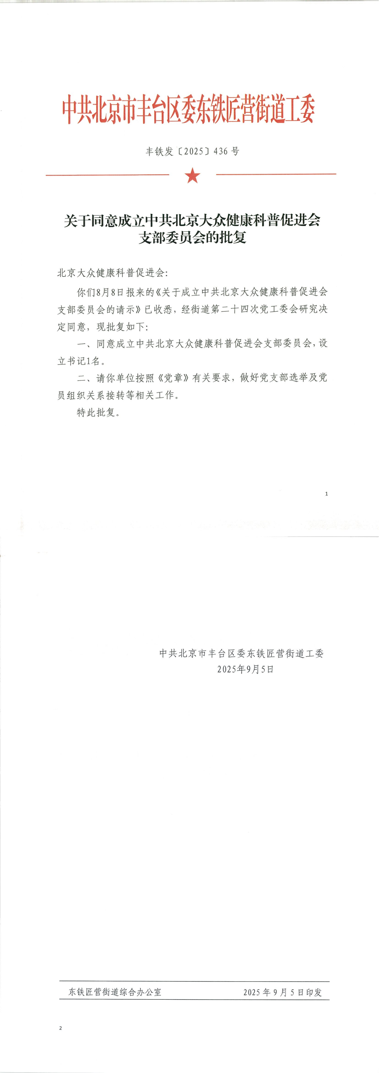 热烈祝贺北京大众健康科普促进会党支部经中共北京市丰台区委东铁匠营街道工作委员会批准,于2025年9月5日正式成立!此次党支部的成立是我会政治生活中的一件大事,标志着促进会党建工作开启了新的篇章。