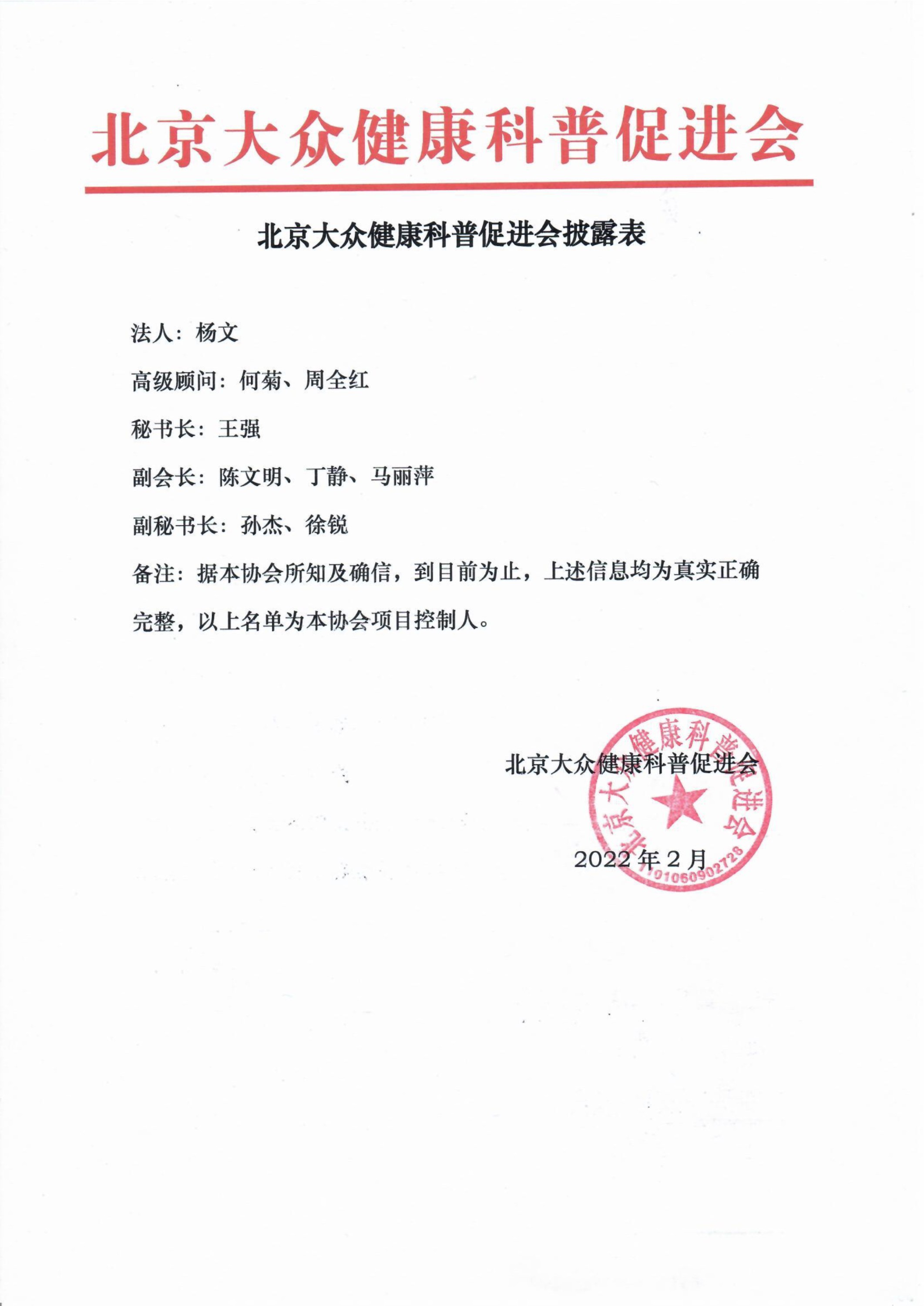 北京大众健康科普促进会主要管理工作人员