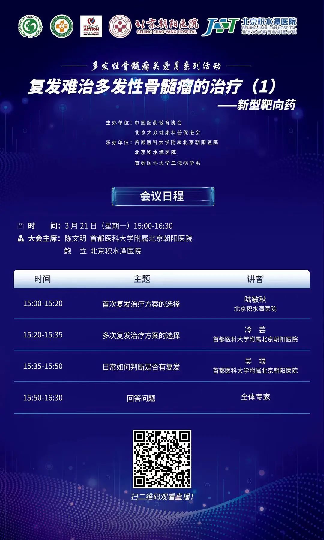 2022年3月21日,北京积水潭医院陆敏秋专家和首都医科大学附属北京朝阳医院冷芸、吴垠等专家和大家共同探讨“复发难治多发性骨髓瘤的治疗(1)”相关课题。 科普直播将于今天下午15点开始,请大家注意扫码观看。