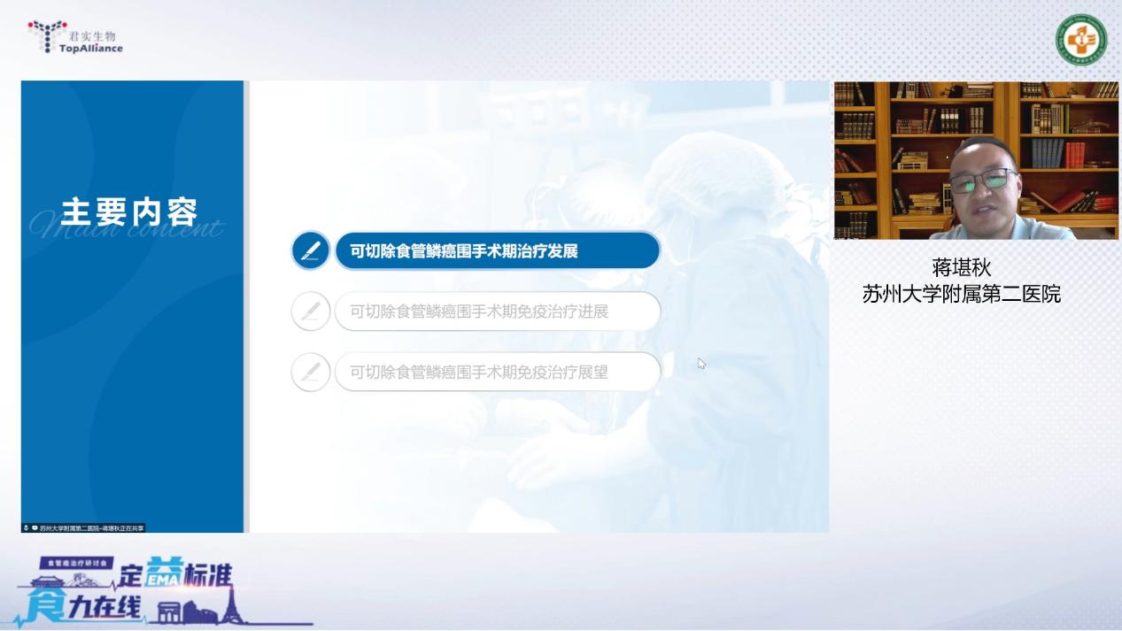 会议由蒋东教授和王蓉教授主持,并在其开场致辞中拉开帷幕。随后在Session1中,蒋堪秋教授带来了以“食管癌围手术期进阶之路”为主题的精彩见解,为与会者提供了食管癌综合治疗的新见解和高获益策略。