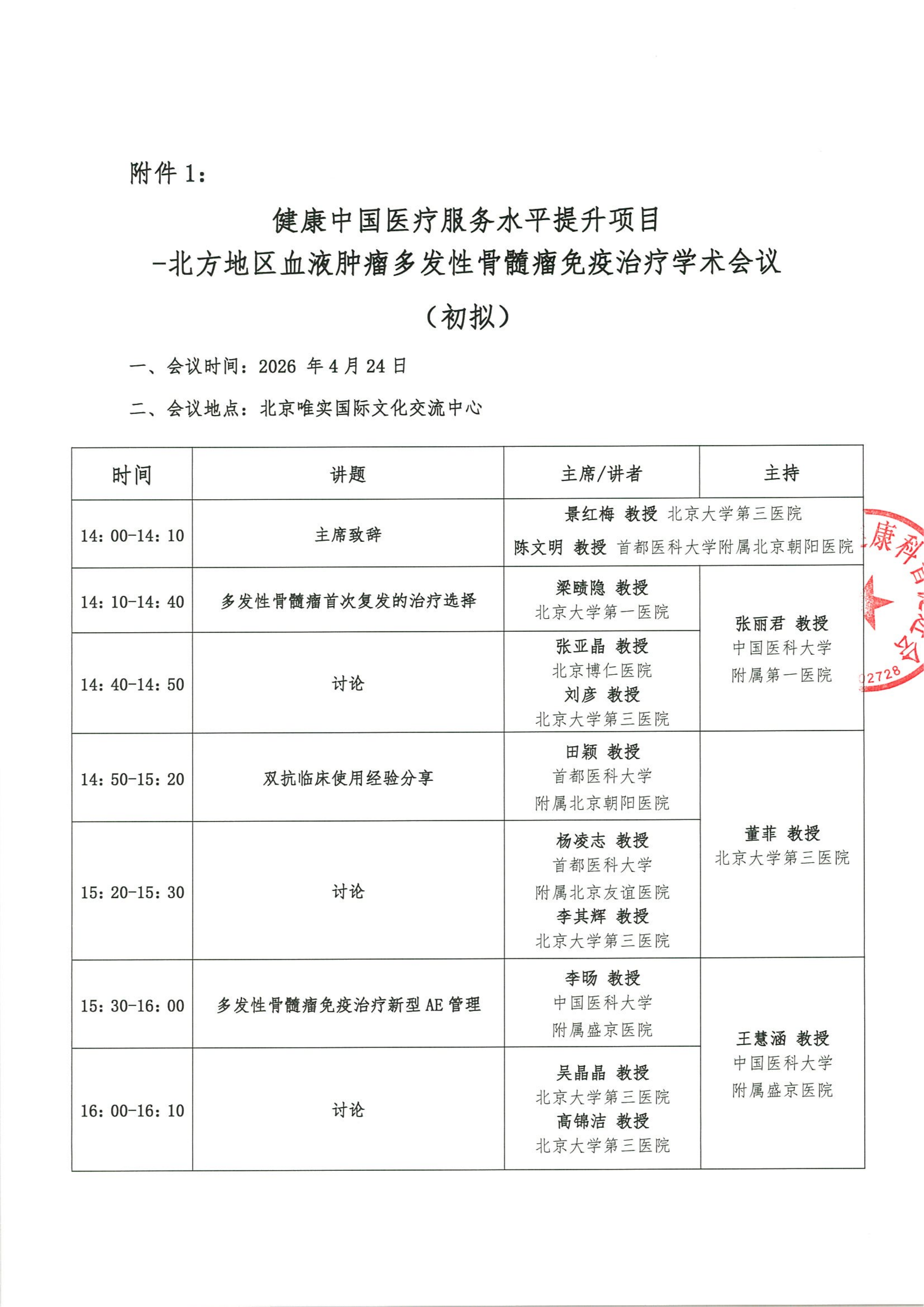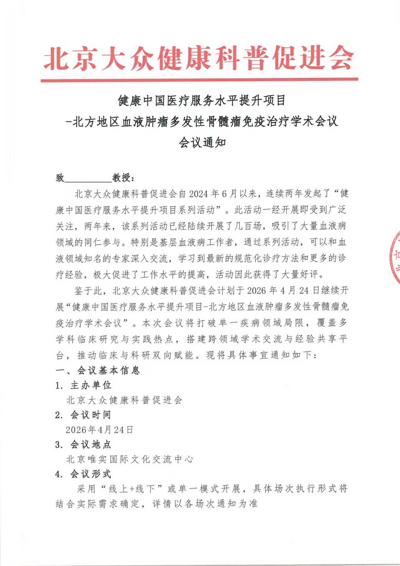 健康中国医疗服务水平提升项目 北方地区血液肿瘤多发性骨髓瘤免疫治疗学术会议
