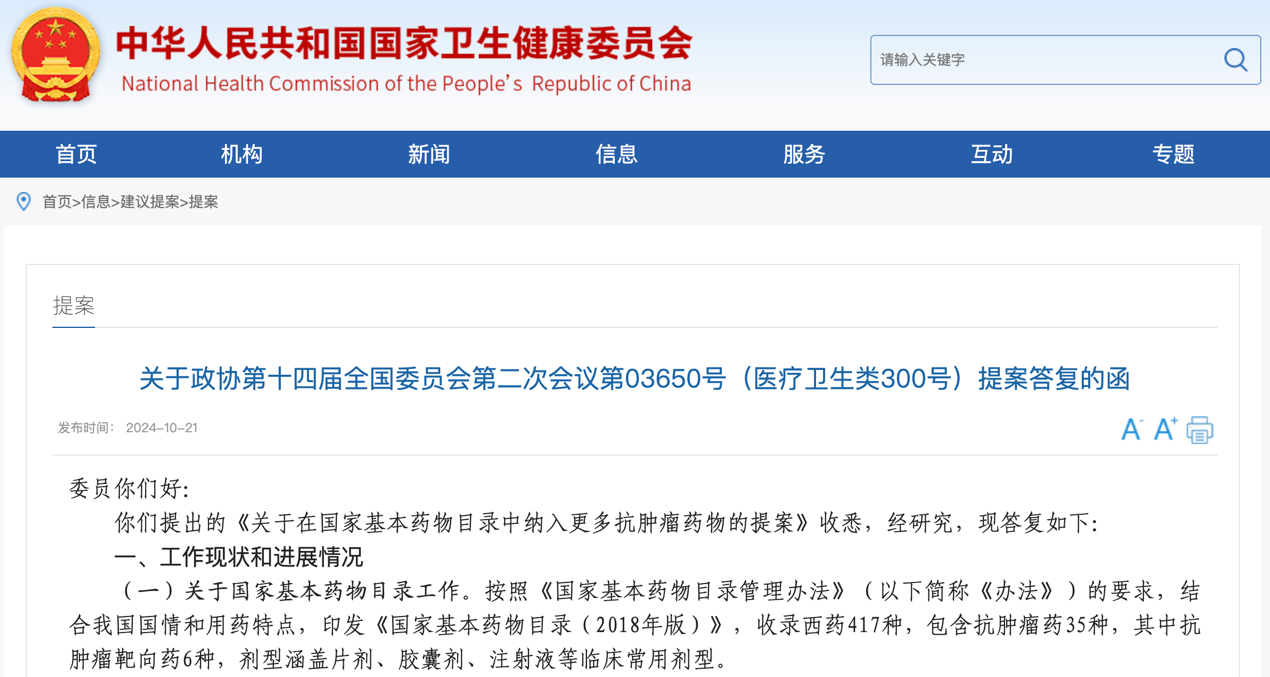 你们提出的《关于在国家基本药物目录中纳入更多抗肿瘤药物的提案》收悉,经研究,现答复如下: