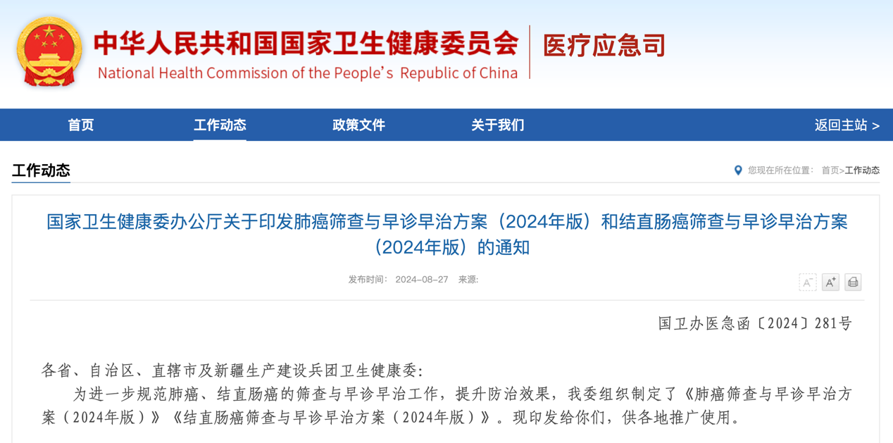 国家卫生健康委办公厅关于印发肺癌筛查与早诊早治方案(2024年版)和结直肠癌筛查与早诊早治方案(2024年版)的通知